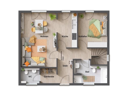 Die Idee dahinter: Alle wichtigen Räume für das tägliche Leben werden im Erdgeschoss barrierefrei geplant, sodass man im Bedarfsfall komplett auf einer Ebene wohnen kann. Konkret bedeutet das: Im Erdgeschoss befindet sich neben Wohnbereich und Küche auch mindestens ein Schlafzimmer oder Gästezimmer sowie ein vollwertiges Duschbad, die beide ohne Stufen erreichbar sind. Somit könnte das Erdgeschoss später als eigenständige Wohneinheit dienen - ideal, falls man im Alter die Treppe meiden möchte oder ein Familienmitglied zeitweise unten wohnen soll (z. B. nach einer OP).