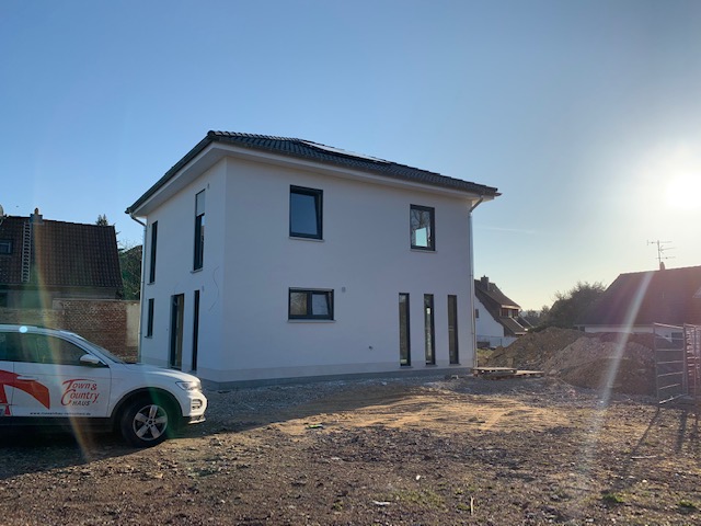 In Remscheid, PLZ 42857, wurde dieses Stadthaus Flair 124 ZD in der Standardausführung realisiert. Ein architektonisches Highlight bilden die drei schmalen, feststehenden Fenster im Erdgeschoss, die der Fassade eine moderne, individuelle Note verleihen und gleichzeitig für zusätzliche Lichtakzente im Innenraum sorgen. Der Baustart erfolgte am 20.11.2020, die Hausübergabe am 21.03.2021 – ein Bauvorhaben, das in kurzer Zeit erfolgreich umgesetzt wurde und urbanes Wohnen zeitgemäß interpretiert.