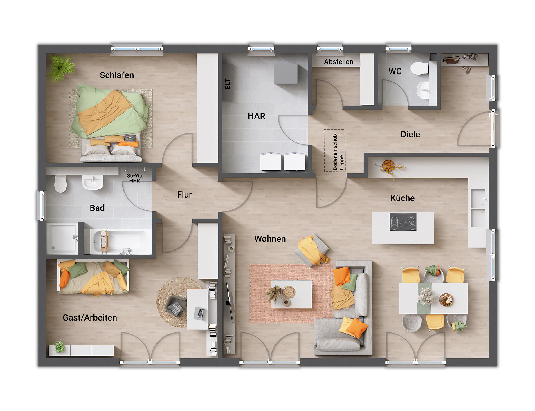 Möchten Sie ein offenes Wohn-Ess-Zimmer mit Zugang zur Terrasse? Brauchen Ihre Kinder getrennte Rückzugsräume? Oder wünschen Sie ein Arbeitszimmer, das sich bei Bedarf in ein Gästezimmer verwandeln lässt?