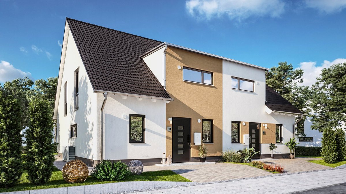 Auch außen muss ein Doppelhaus nicht zwingend wie eineiige Zwillinge aussehen. Oft wünschen sich Bauherren einen individuellen Touch pro Hälfte - und das ist machbar. Unterschiedliche Farbgebung der Fassaden, verschiedene Fensteraufteilungen oder Haustür-Gestaltungen können dem Gesamtgebäude trotz Einheitlichkeit einen personalisierbaren Charakter geben. Wenn der Bebauungsplan es erlaubt, sind sogar abweichende Dachformen oder Fassadenstile denkbar. In vielen Neubaugebieten ist zwar eine gewisse harmonische Optik gefordert, aber innerhalb dieser Rahmenbedingungen lässt sich viel anpassen: z.B. eine Hälfte mit Klinker, die andere verputzt (in abgestimmten Farbtönen), oder ein versetztes Dach zwischen den Hälften. So entsteht kein „Schablonenhaus“, sondern Ihr individuelles Traumhaus - nur eben zweimal anders! Bei Town & Country Haus gibt es z.B. über 40 Hausvarianten und unzählige Gestaltungsmöglichkeiten, die auch im Doppelhaus umgesetzt werden können.