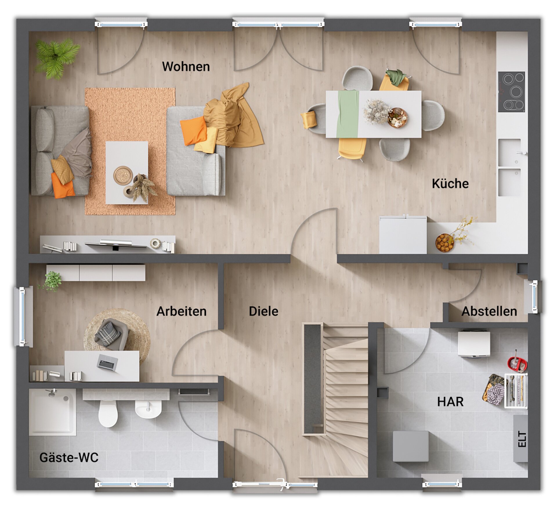 Im Erdgeschoss betreten Sie ein großzügiges Entrée, von dem aus sich der Blick direkt in den offenen Wohnbereich öffnet. Rechts liegt die helle Küche, die nahtlos in den Wohn-Essbereich übergeht - der ideale Treffpunkt für die ganze Familie. Große Fenster lassen viel Tageslicht herein und geben den Blick frei auf die Terrasse und den Garten. Stellen Sie sich vor, wie Sie hier am Esstisch sitzen, während die Kinder durch die Terrassentür in den Garten hinauslaufen können. Angrenzend an die Küche befindet sich ein praktischer Hauswirtschaftsraum, in dem Ihre Waschmaschine, Vorräte und Haustechnik Platz finden - so bleibt die Küche stets aufgeräumt. Ebenfalls im Erdgeschoss: ein Gästezimmer (das Sie alternativ als Homeoffice nutzen können) sowie ein Gäste-WC mit Dusche, damit Übernachtungsgäste ihr eigenes kleines Bad haben und für die tägliche Nutzung eine zusätzliche Dusche zur Verfügung steht.