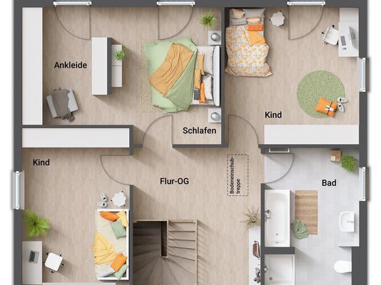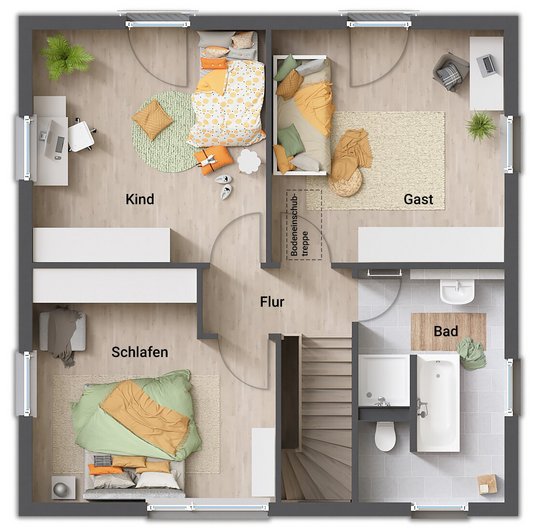 - Zwei Vollgeschosse = mehr Platz: Ohne Dachschrägen im Obergeschoss kann jeder Winkel des Hauses optimal genutzt werden. Schlaf- und Kinderzimmer unterm Dach haben volle Stehhöhe und lassen sich frei möblieren - das schafft ein großzügiges Raumgefühl auf beiden Etagen.