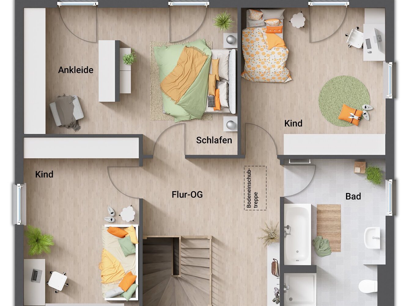 Die größte Stärke der Stadtvilla im Grundriss: Es gibt kein Dachgeschoss mit Schrägen, sondern zwei komplett gleichwertige Etagen. Das Obergeschoss verfügt in der Regel über volle Raumhöhen und gerade Wände bis zur Decke. Dadurch entsteht oben fast genauso viel Wohnfläche wie unten - keine Kniestöcke, keine Flächenverluste. Du kannst z.B. vier gleich große Schlafzimmer im Obergeschoss planen oder drei Zimmer plus ein großes Familienbad, ohne dass irgendwo der Kopf eingezogen werden muss. Auch die Möbelaufstellung ist einfacher: Schränke, Regale oder Betten finden an jeder Wand Platz, während man in einem Dachgeschosshaus oft Maßanfertigungen für schräge Wände braucht. Zwei Vollgeschosse bedeuten auch, dass im Treppenhaus ein normaler Aufgang ohne komplizierte Wendeln ausreicht - das erleichtert den Alltag (denk ans Möbeltreppen!). Viele Bauherren genießen es, oben wie unten hohe Räume und volle Fenster zu haben, was im Dachgeschoss eines Satteldach-Hauses kaum möglich ist. Kurzum: Eine Stadtvilla schenkt Freiraum, der Planern und Bewohnern alle Möglichkeiten öffnet.