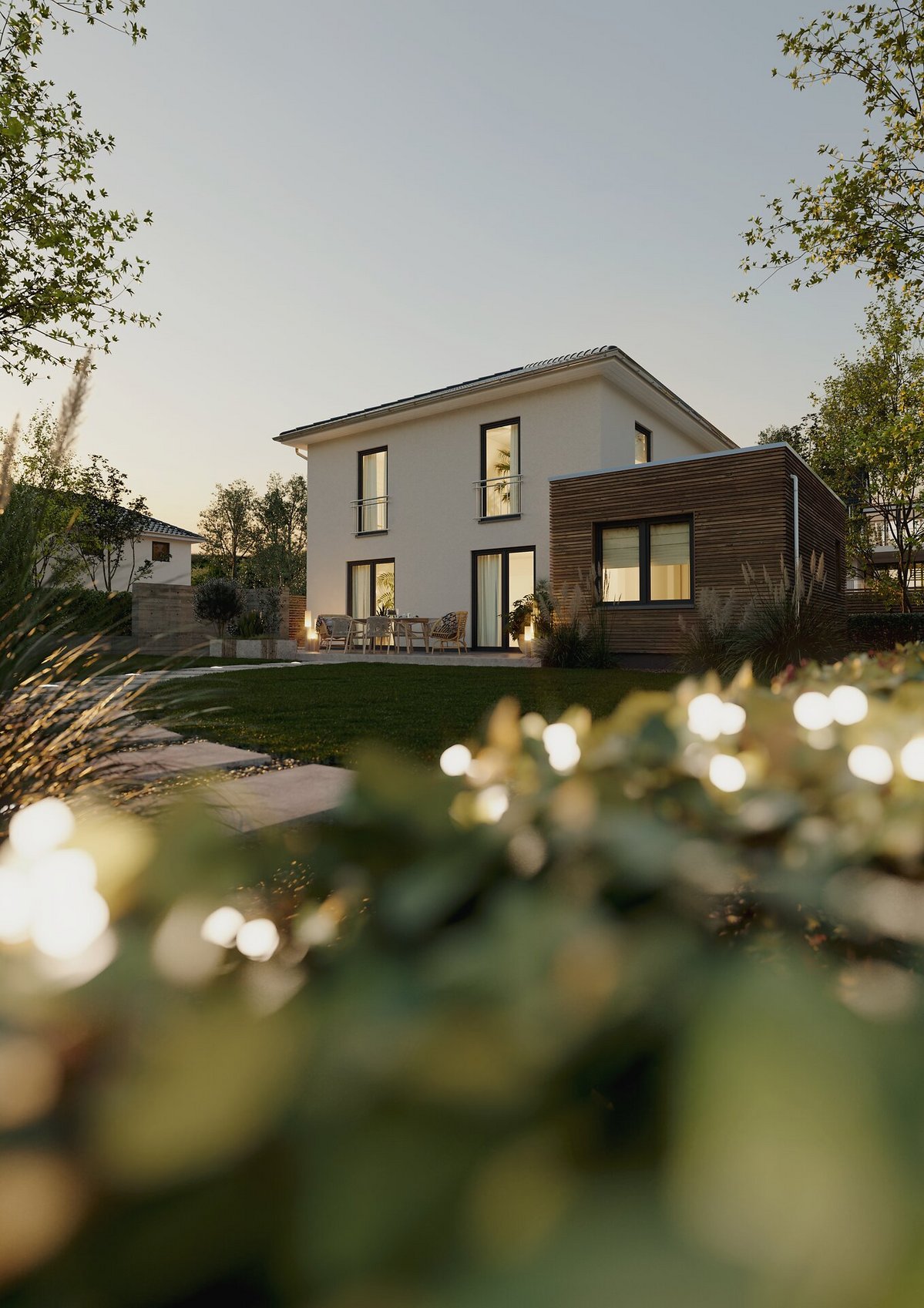 Gerade in städtischen Gebieten wie Remscheid, Solingen oder Wuppertal erfüllt die Stadtvilla einen besonderen Wunsch: urban wohnen und dennoch im Grünen sein. Dieser Haustyp wird oft auf Grundstücken realisiert, die eine Kombination aus Stadtnähe und Privatheit bieten - zum Beispiel in ruhigen Wohnvierteln oder Randlagen, wo man einerseits schnell in der City ist, andererseits aber einen eigenen Garten genießen kann. Eine Stadtvilla nutzt das Grundstück optimal aus: Durch die zwei Etagen benötigt sie nicht die komplette Fläche ebenerdig, was Platz für einen schönen Garten oder eine große Terrasse lässt. Familien mit Kindern schätzen dies enorm - während die Kleinen im Garten spielen, können die Eltern die Vorzüge der Stadt (Einkaufsmöglichkeiten, Schulen, Kultur) in unmittelbarer Nähe wissen. Auch wer gerne Gäste empfängt, genießt das repräsentative Wohnumfeld mit Garten: Grillabende auf der Terrasse oder Kaffeetrinken unter dem eigenen Pavillon werden mitten in der Stadt möglich.
